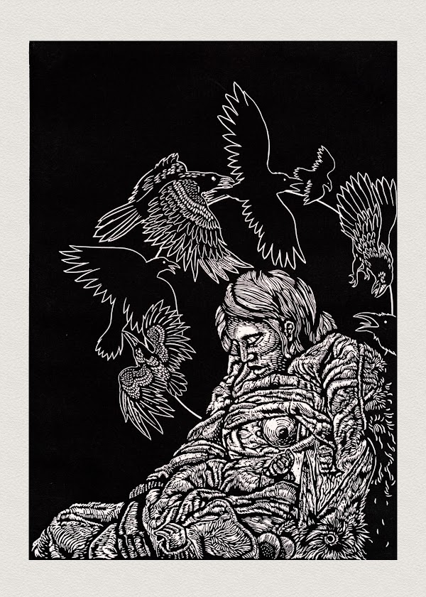 Se consigue trabajando sobre una matriz metálica que se “araña” mediante técnicas mecánicas o químicas. Las partes oscuras de la imagen corresponden a las incisiones, donde se deposita la tinta, y quedarán en blanco las zonas que no quedan en contacto. Este tipo de grabado tiene muchas clasificaciones según cómo se realiza la matriz, aunque todas cumplen con las características antes mencionadas: barniz blando, tinta china, esmaltografía, entre otras.